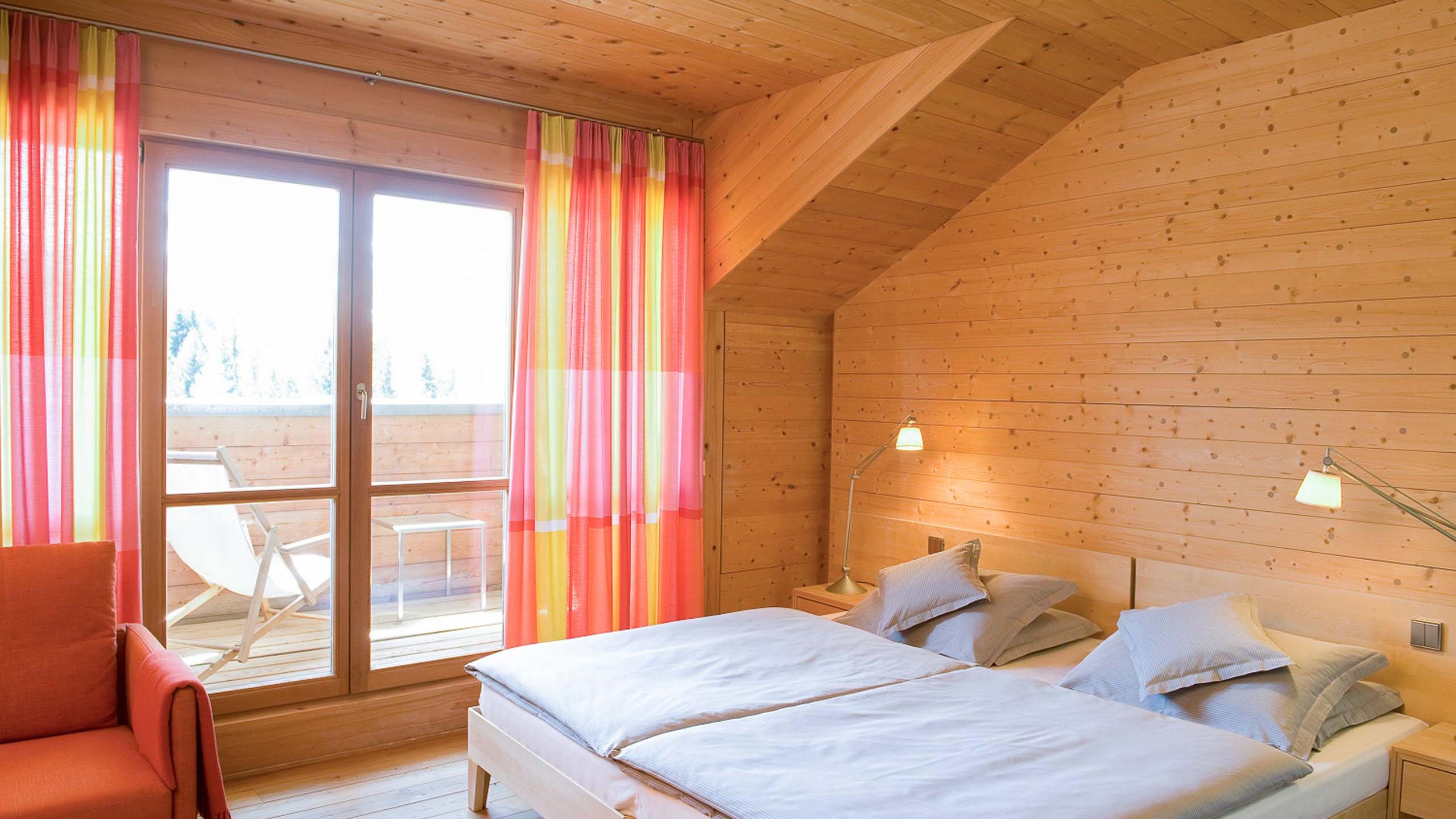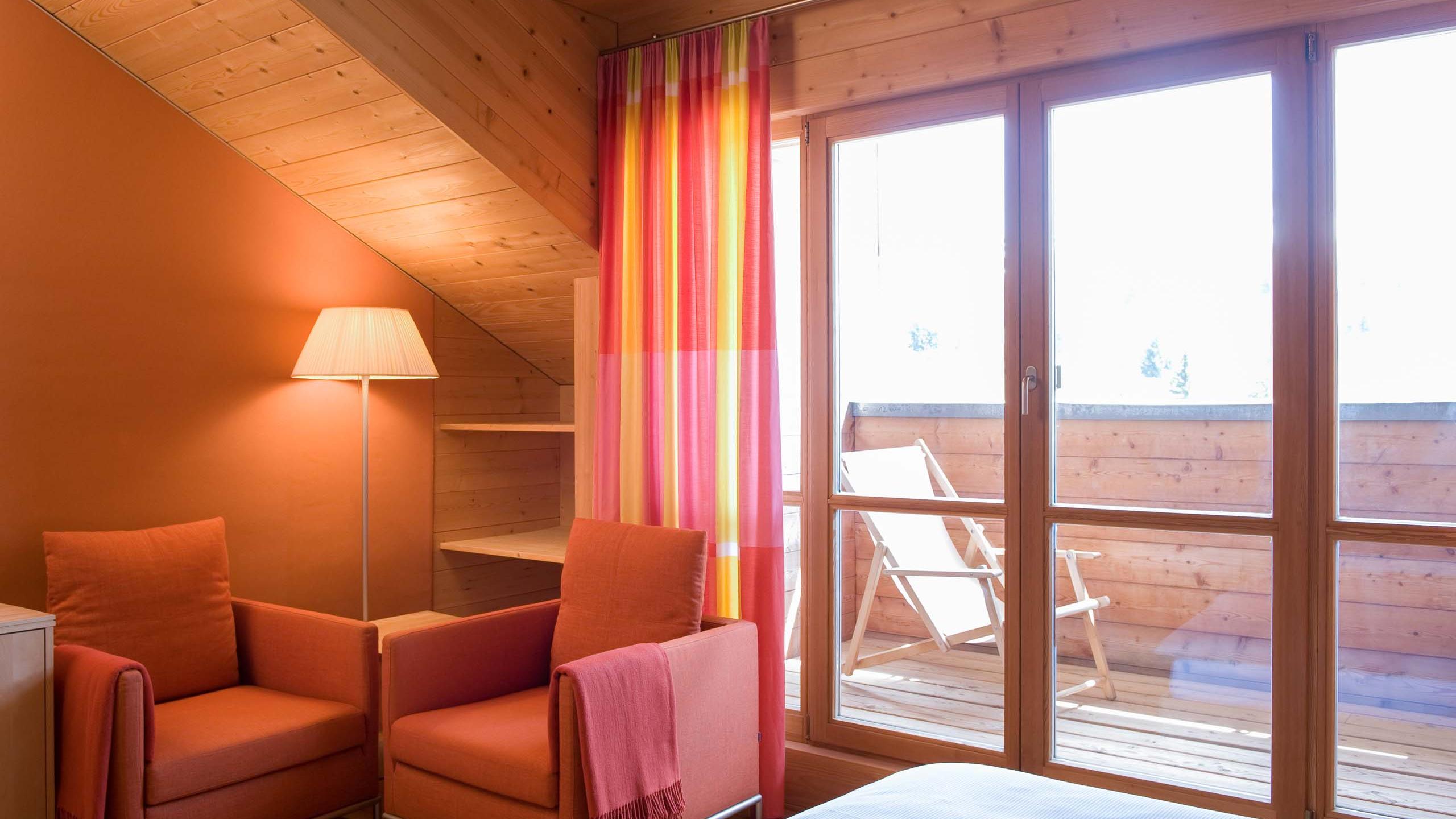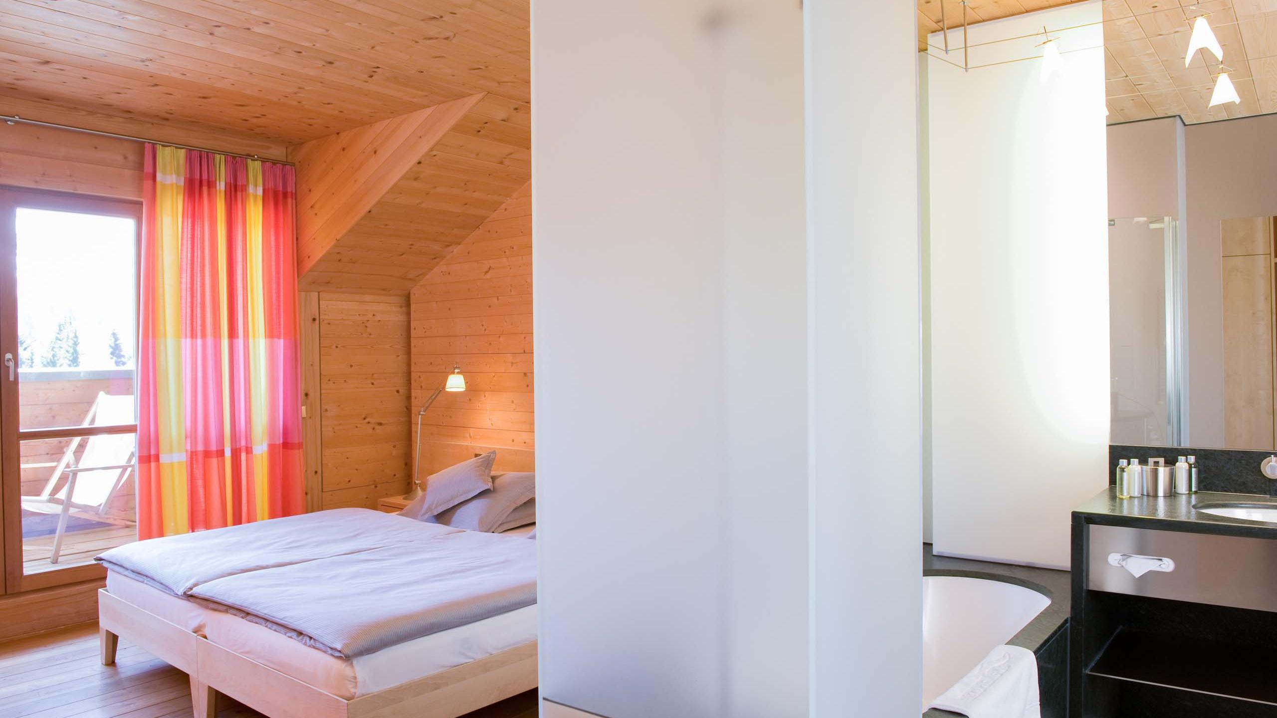 Camera mansardata con letto matrimoniale. Bagno in vetro con vasca o doccia combinate, bidet e WC. Balcone con vista sulle Dolomiti.