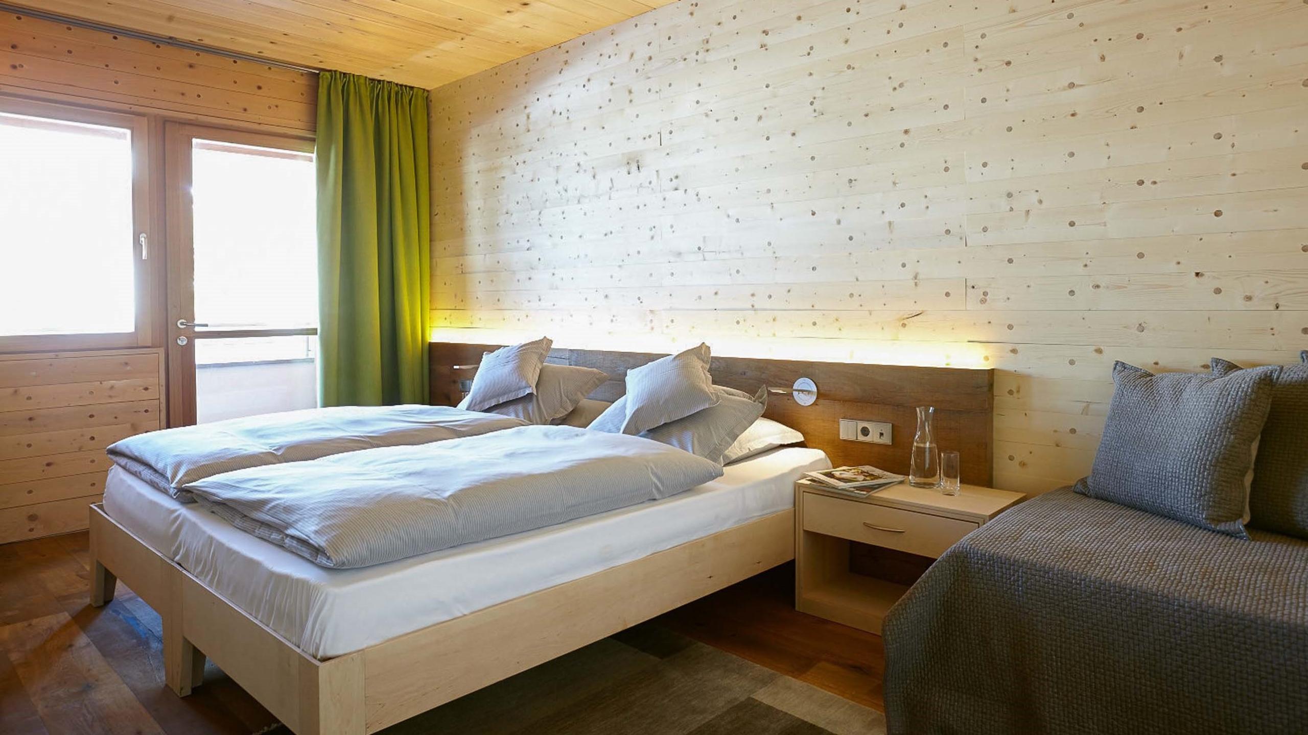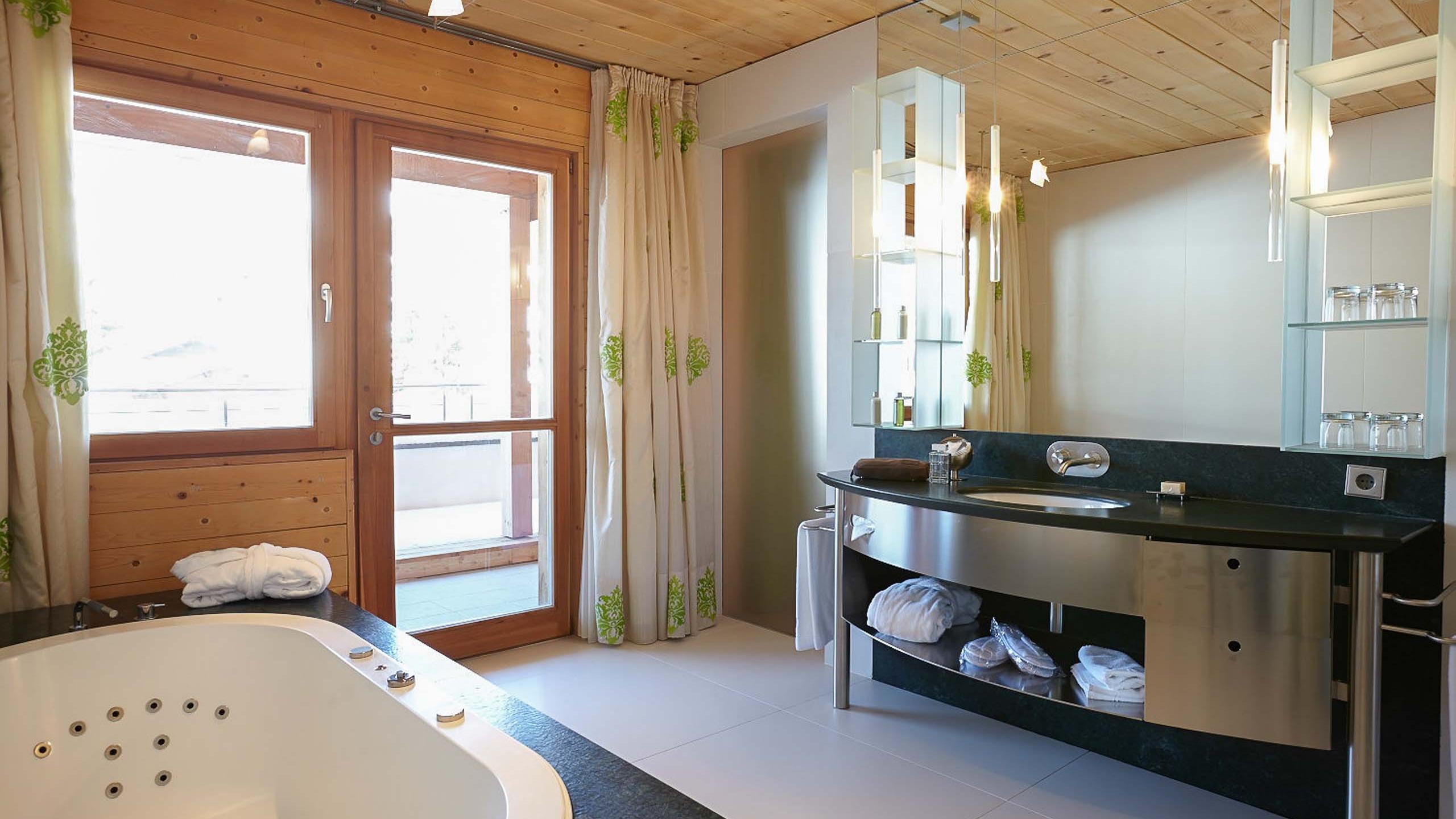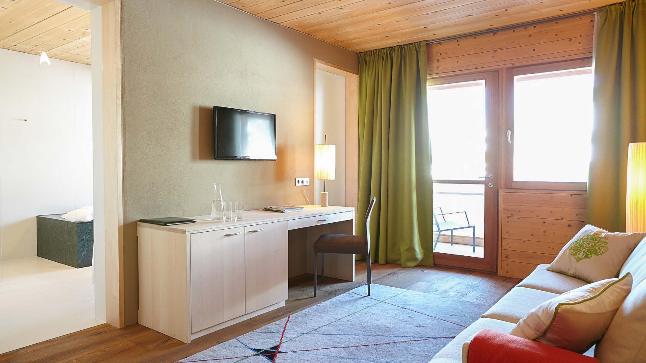 La Senior Suite regala un’atmosfera romantica e momenti rilassanti in due camere separate realizzate in legno di abete rosso e larice. Il bagno, progettato con cura, convince per la riuscita combinazione di vetro e granito verde; il WC e il bidet si trovano in una stanza a parte. Mettetevi comodi sul balcone con vista sul giardino e godetevi il comfort dei nostri servizi inclusi come la postazione per il tè con bollitore, il minibar con acqua minerale, la borsa wellness con accappatoio, la TV satellitare, la cassetta di sicurezza e il telefono.