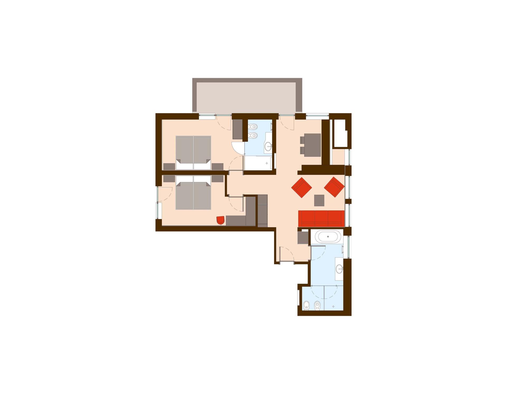 Due camere da letto separate e un soggiorno. Due bagni. Balcone o ampia terrazza con vista sul giardino e sulle Dolomiti.