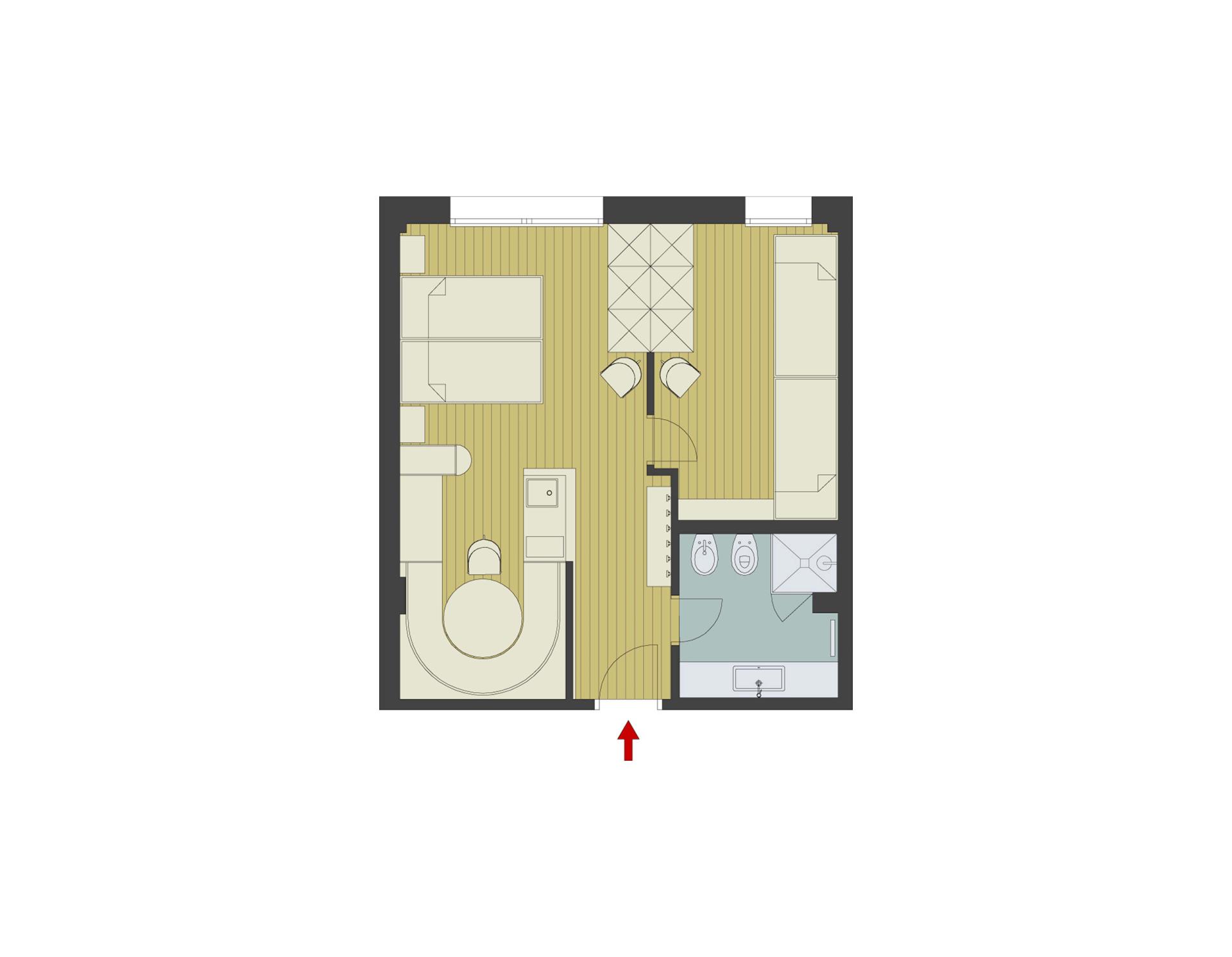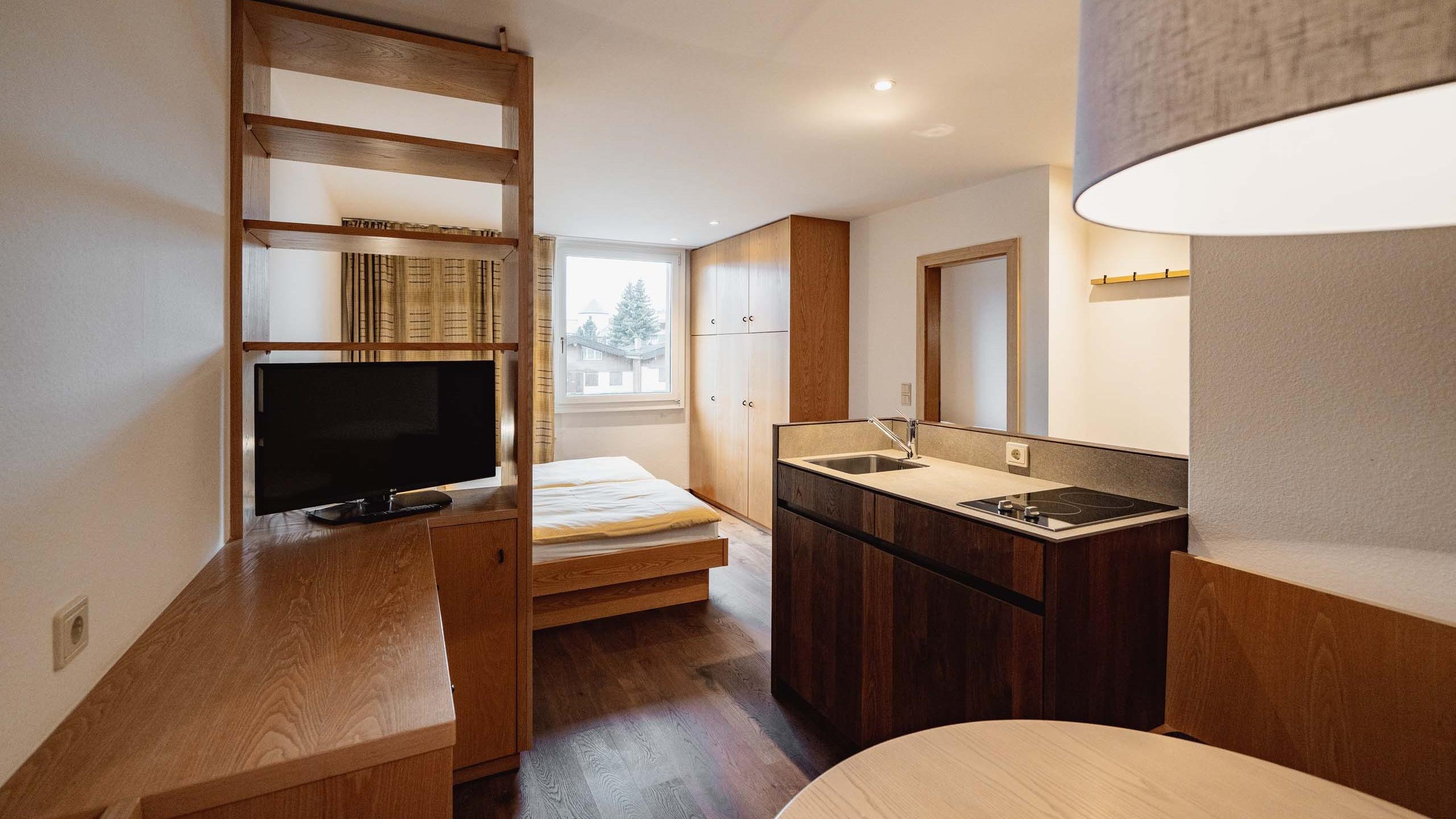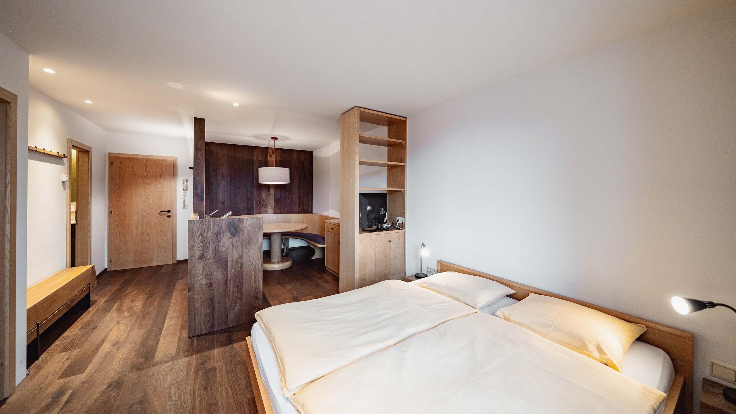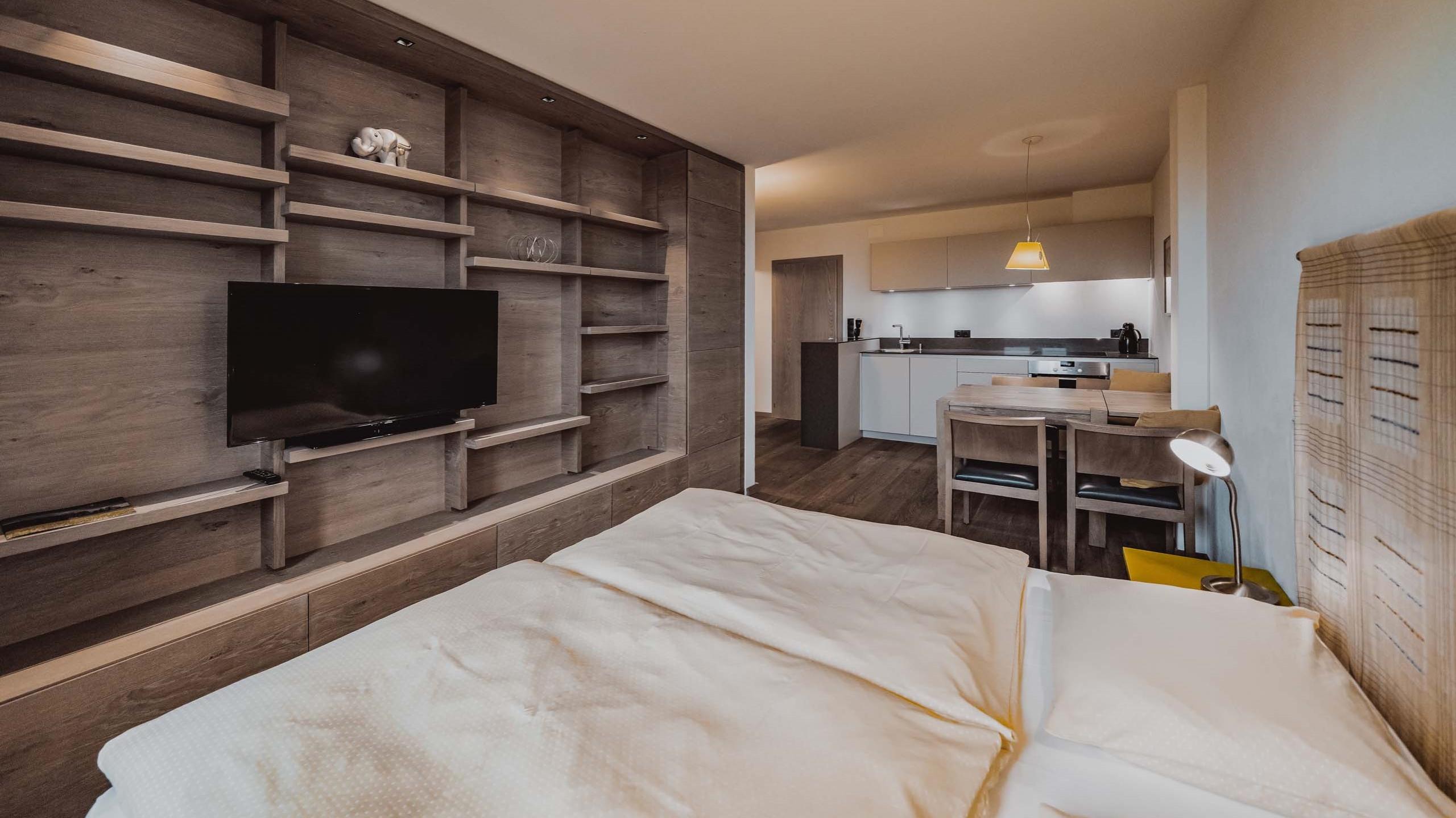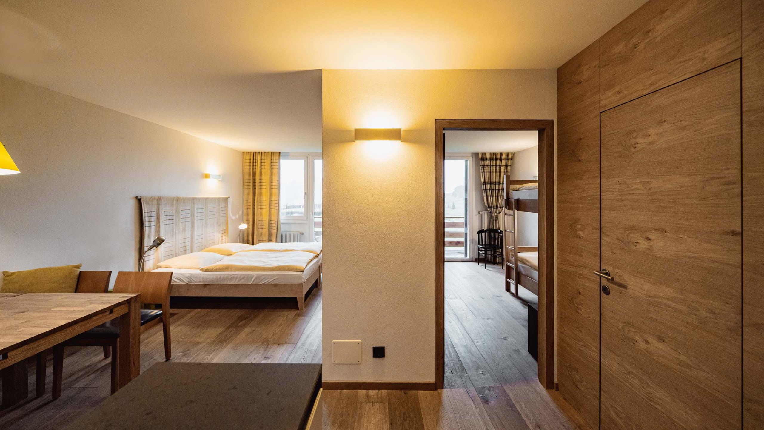 Appartamento bilocale dall’atmosfera familiare dotato di letto matrimoniale, letto a castello, accogliente angolo soggiorno, cucinino ed entrata separata. Le dotazioni includono TV satellitare a schermo piatto con radio integrata, telefono, cassetta di sicurezza e WiFi. Il bagno dispone di vasca con doccia, lavabo con grande specchio, WC, bidet, asciugacapelli, set di cortesia e morbidi asciugamani. Alcuni appartamenti sono con balcone.
