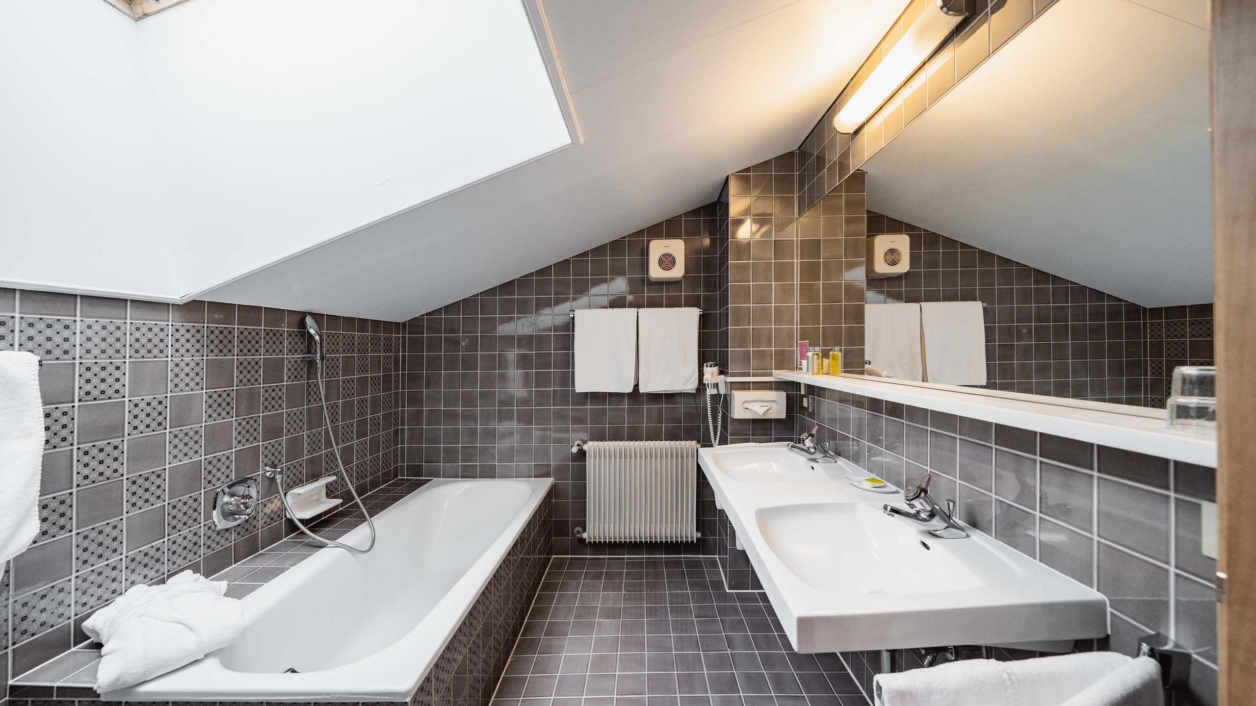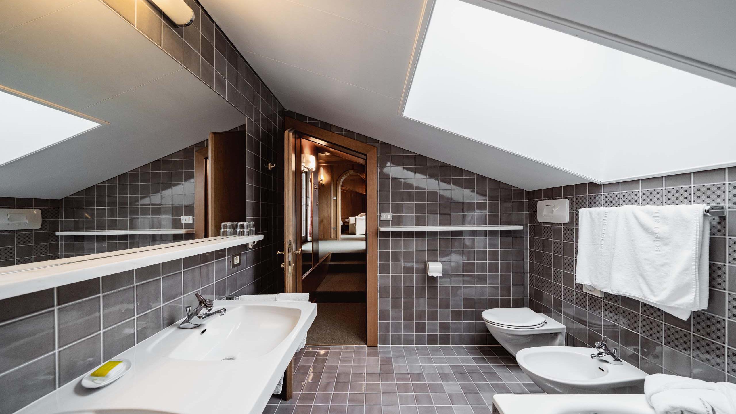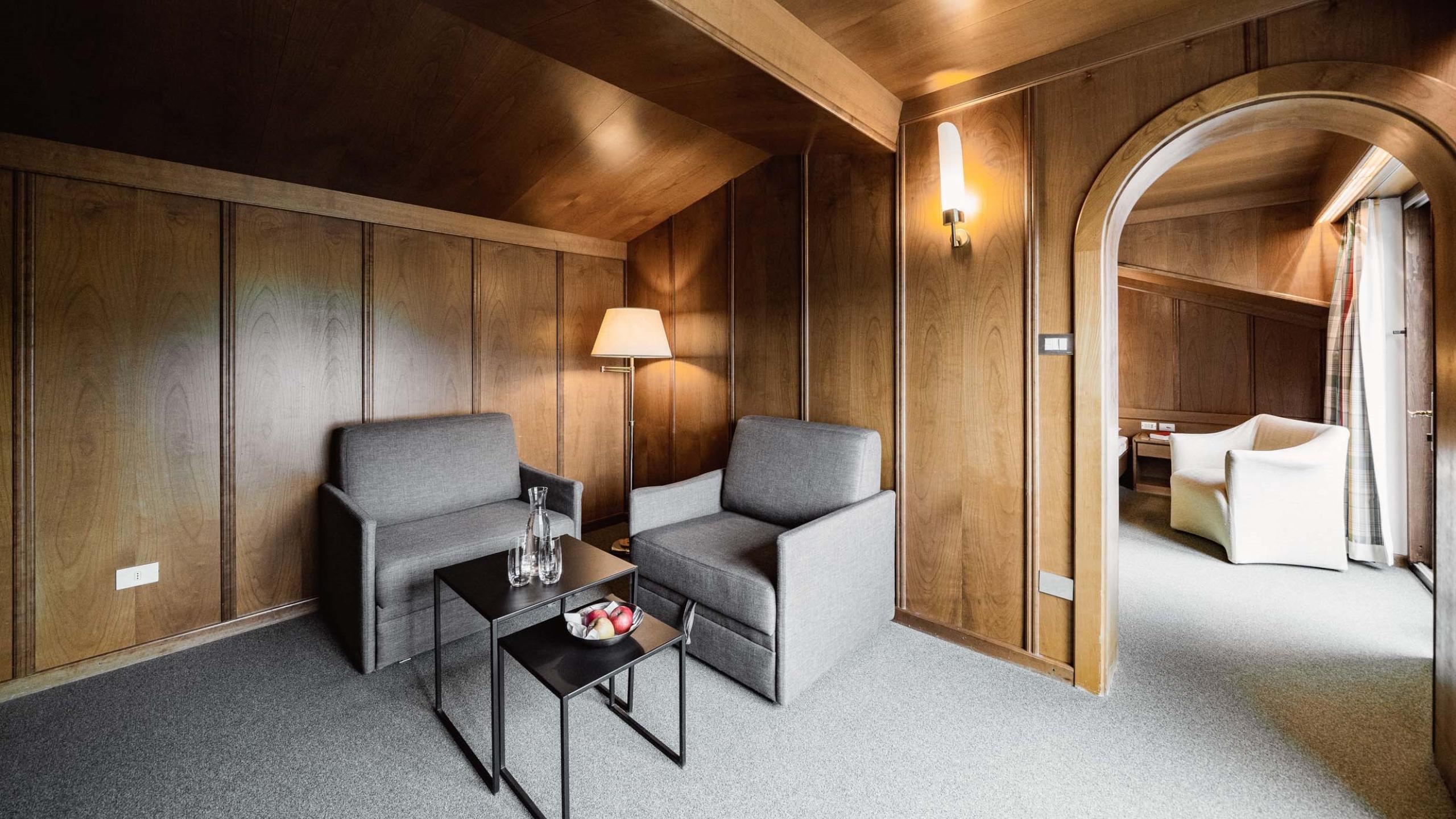 Le suite sono rivolte a sud con vista sulle Dolomiti e offrono una zona giorno e notte e un grande balcone mansardato. Il bagno è dotato di vasca con doccia, lavabo con grande specchio, WC, bidet, asciugacapelli, set di cortesia e morbidi asciugamani. Le dotazioni includono anche due TV satellitari a schermo piatto con radio integrata, telefono, cassetta di sicurezza e WiFi.